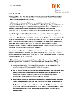 Das BIK in seiner Stellungnahme verurteilt den Austritt der Türkei aus der Istanbul-Konvention scharf und fordert Konsequenzen für die deutsch- bzw. europäisch-türkischen Beziehungen. Deutschland und die EU sind gefordert, zu handeln, damit diese Entwicklung nicht von anderen Ländern innerhalb der EU übernommen wird.