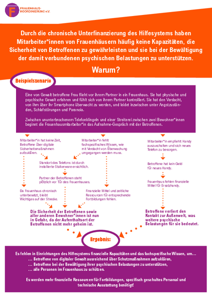 „Das Hilfesystem für gewaltbetroffene Frauen und ihre Kinder ist chronisch unterfinanziert. Dadurch haben Frauenhäuser und Fachberatungsstellen häufig keine Kapazitäten, umfassenden Schutz vor digitaler Gewalt sicherzustellen,“ erklärt Heike Herold, Geschäftsführerin von FHK. „Viele Mitarbeiter*innen haben großes Interesse daran, sich zum Schutz vor digitaler Gewalt fortzubilden, um Betroffene angemessen unterstützen zu können. Dafür fehlen jedoch schlichtweg finanzielle und zeitliche Ressourcen und damit bleibt das Thema häufig auf der Strecke – auf Kosten der Betroffenen.“