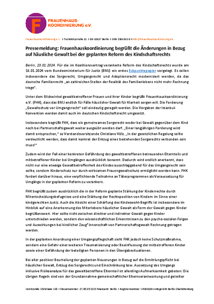 Insbesondere begrüßt FHK, dass ein gemeinsames Sorgerecht weder bei Gewalt gegenüber dem Kind noch bei Partnerschaftsgewalt weiter ausgeübt werden darf.