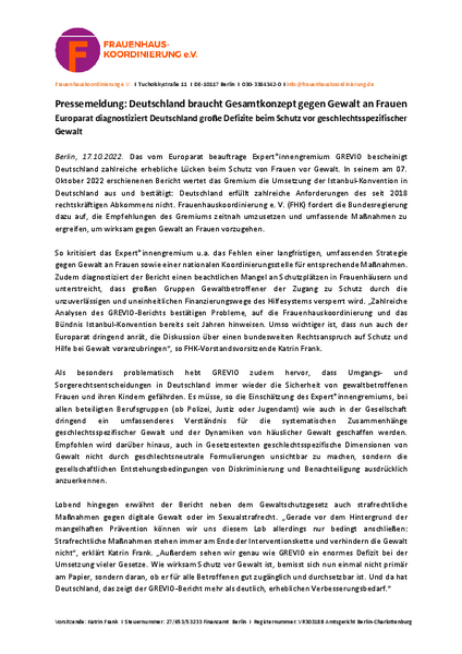 Berlin, 17.10.2022. Das vom Europarat beauftrage Expert*innengremium GREVIO bescheinigt Deutschland zahlreiche erhebliche Lücken beim Schutz von Frauen vor Gewalt. In seinem am 07. Oktober 2022 erschienenen Bericht wertet das Gremium die Umsetzung der Istanbul-Konvention in Deutschland aus und bestätigt: Deutschland erfüllt zahlreiche Anforderungen des seit 2018 rechtskräftigen Abkommens nicht. Frauenhauskoordinierung e. V. (FHK) fordert die Bundesregierung dazu auf, die Empfehlungen des Gremiums zeitnah umzusetzen und umfassende Maßnahmen zu ergreifen, um wirksam gegen Gewalt an Frauen vorzugehen.