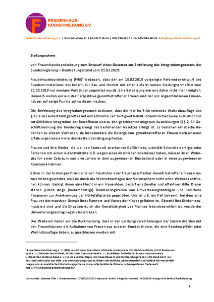 Obwohl die äußerst kurze Stellungnahmefrist zum Referentenentwurf des Bundesministeriums des Innern, für Bau und Heimat zum Entwurf eines Gesetzes zur Entfristung des Integrationsgesetzes der Bundesregierung bereits abgelaufen ist, weist FHK in ihrer Stellungnahme auf die schwierigen Folgen für gewaltbetroffene geflüchtete Frauen durch die Wohnsitzauflagen hin. Die genauen Ausführungen dazu in unserer Stellungnahme