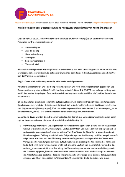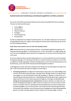 Die seit dem 25.Mai 2018 anzuwendende Datenschutz-Grundverordnung (DS-GVO) stellt verschiedene Anforderungen an die Verarbeitung und Aufbewahrung erhobener Daten, die auch für die Beratungs- und Betreuungsarbeit von Frauenhäusern oder Beratungsstellen relevant sind.