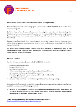 Zur Vorbereitung auf eine Coronavirus-Pandemie mit einer möglichen Quarantäne oder der Ansteckung einer Mitarbeiter_in oder einer Bewohner_in im Frauenhaus mit Coronavirus SARS-CoV-2 empfehlen wir, bereits jetzt einen Pandemieplan für das Frauenhaus zu erstellen. Hilfestellungen dazu finden Sie im unten stehenden Dokument (Abschnitt: Anlage „Informationen zu einem Pandemieplan für das Frauenhaus“).