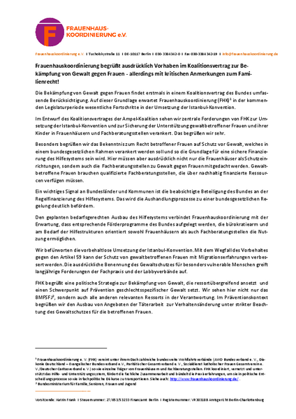 Frauenhauskoordinierung (FHK) begrüßt ausdrücklich Vorhaben im Koalitionsvertrag zur Bekämpfung von Gewalt gegen Frauen – allerdings mit kritischen Anmerkungen zum Familienrecht!