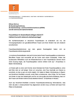 „In mehreren Bundesländern sind seit Wochen keine freien Frauenhausplätze zu bekommen. Betroffene Frauen sind verzweifelt auf der Suche nach einem Schutzplatz. Weder das bundesweite Hilfetelefon noch die Mitarbeiterinnen in den Frauenhäusern können ihnen einen Ausweg zeigen, die Frauenhausplätze reichen einfach nicht aus.“ (Frauenhaus in Baden-Württemberg)