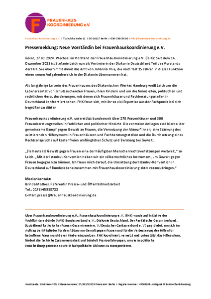 Als langjährige Leiterin des Frauenhauses des Diakonischen Werkes Hamburg weiß Leich um die Lebensrealität von schutzsuchenden Frauen, ihren Kindern und um die finanziellen, politischen und rechtlichen Herausforderungen, mit denen sich Frauenhäuser und Fachberatungsstellen in Deutschland konfrontiert sehen. FHK freut sich, mit ihr so viel Expertise aus der Fachpraxis bei sich begrüßen zu dürfen.