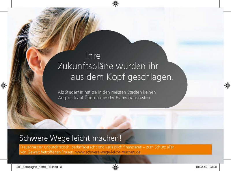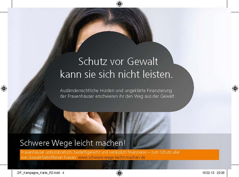 „Schwere Wege leicht machen!“ – unter diesem Titel warb eine Kampagne von Frauenhauskoordinierung und der Zentralen Informationsstelle Autonomer Frauenhäuser (ZIF) bundesweit für einen schnellen und unbürokratischen Zugang zu Schutz und Hilfe für gewaltbetroffene Frauen und ihre Kinder ─ unabhängig von deren Aufenthaltsstatus, Wohnort, Einkommen oder einer Behinderung.