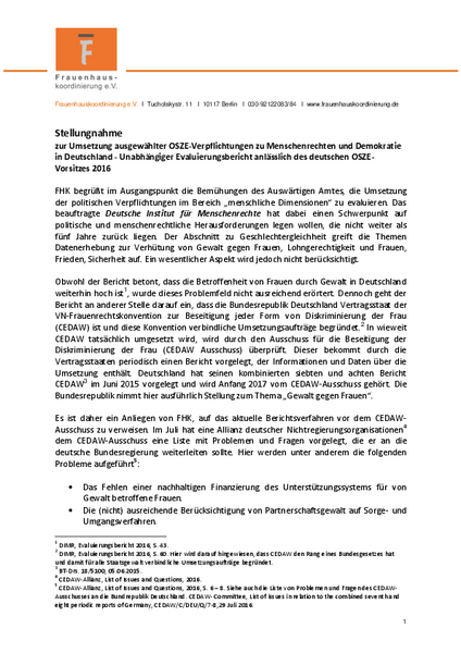 Frauenhauskoordinierung fordert die Bundesrepublik Deutschland auf, bei der Evaluierung der „menschlichen Dimension“ das Thema Gewalt gegen Frauen umfassend und ressort-übergreifend zu berücksichtigen. Nur wenn die Bundesregierung das Thema Gewalt gegen Frauen auf allen Ebenen und in allen Berichtsverfahren gleichermaßen bearbeitet, ist der politische Wille, geschlechtsspezifische Gewalt zu bekämpfen wirklich ernst zu nehmen.