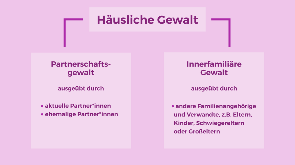 Um passende Hilfeangebote machen zu können, ist wichtig, wer die Gewalt ausübt und wer von ihr betroffen ist. Daher wird zwischen Partnerschaftsgewalt und innerfamiliärer Gewalt unterschieden.